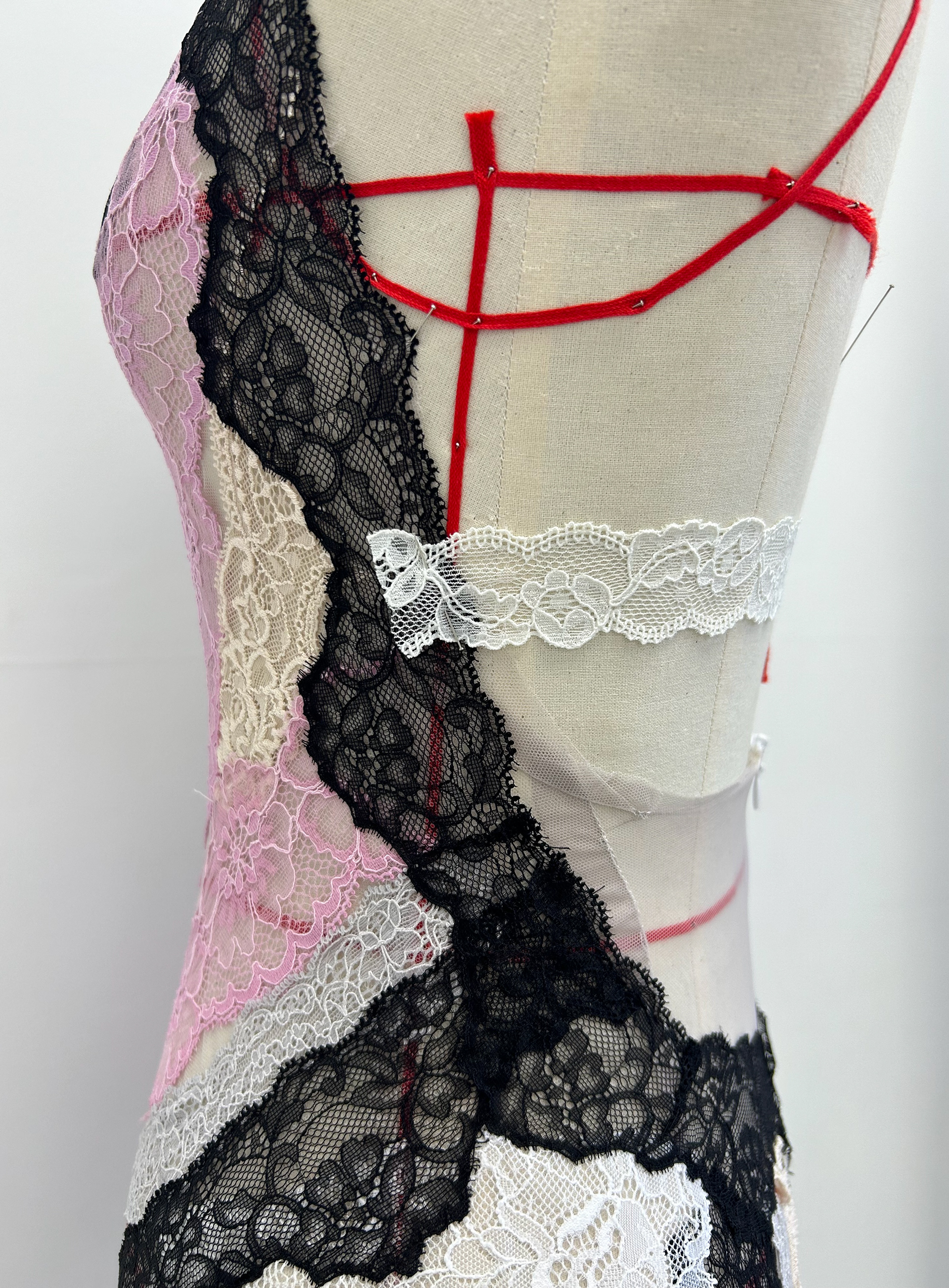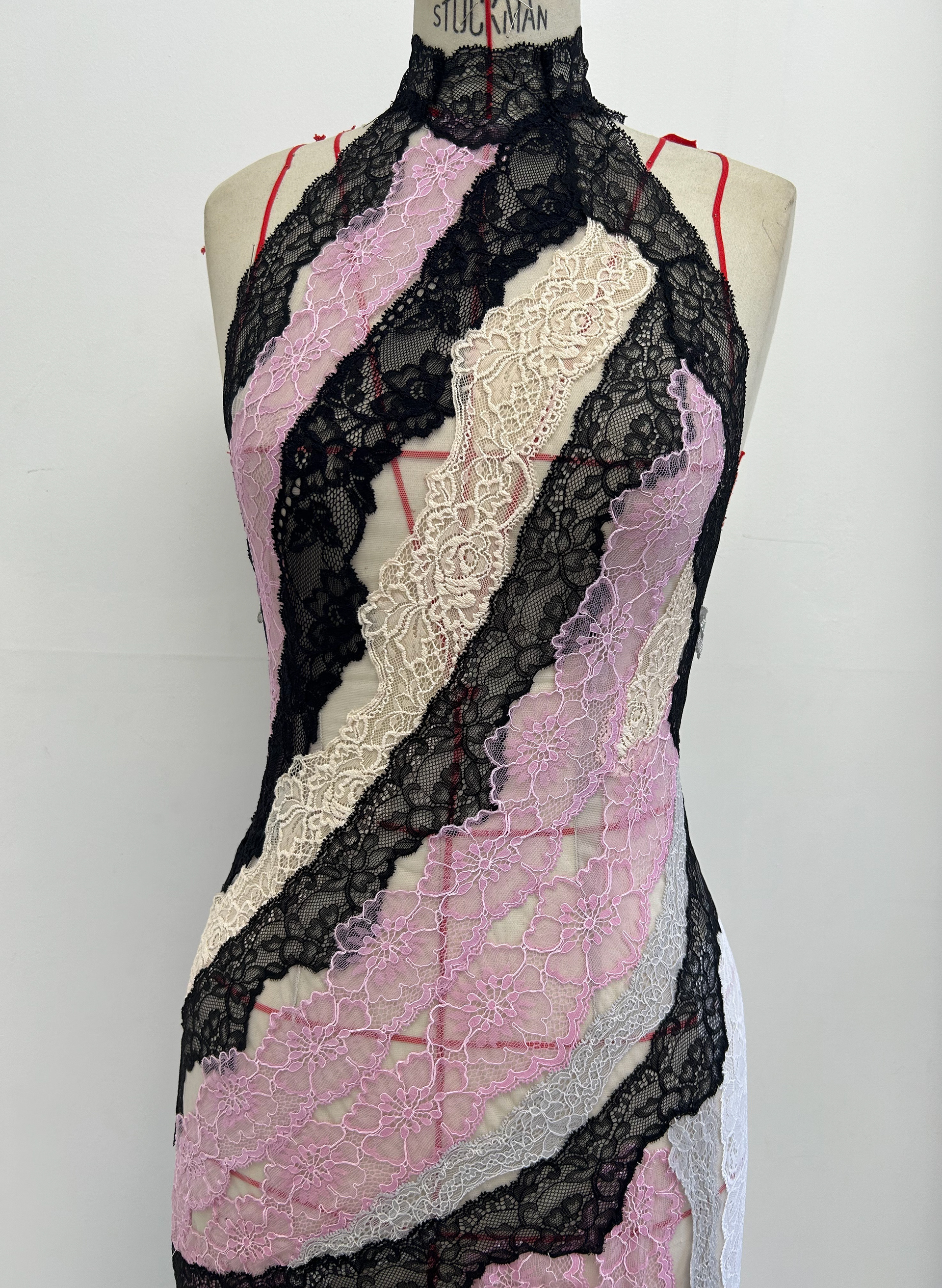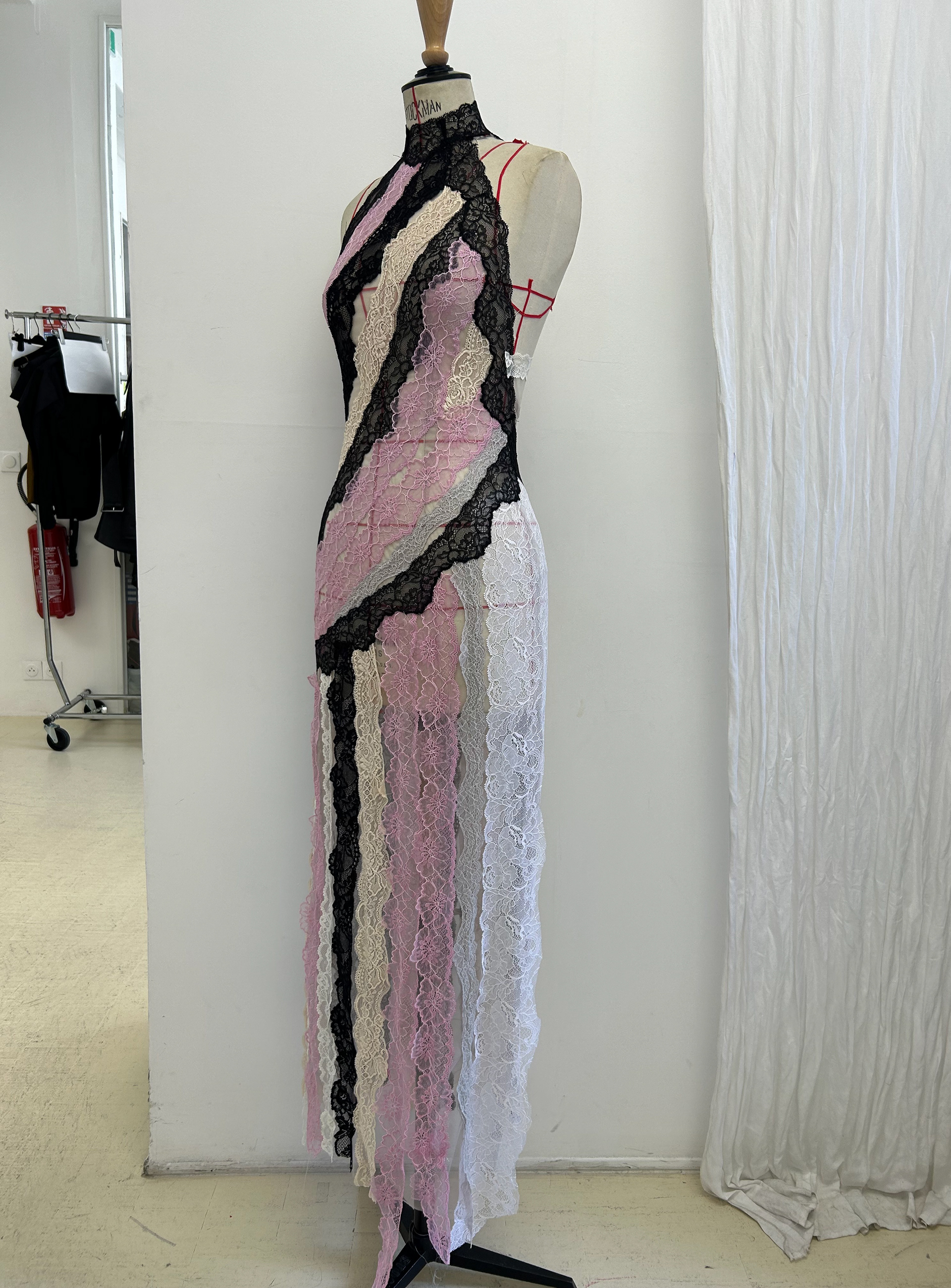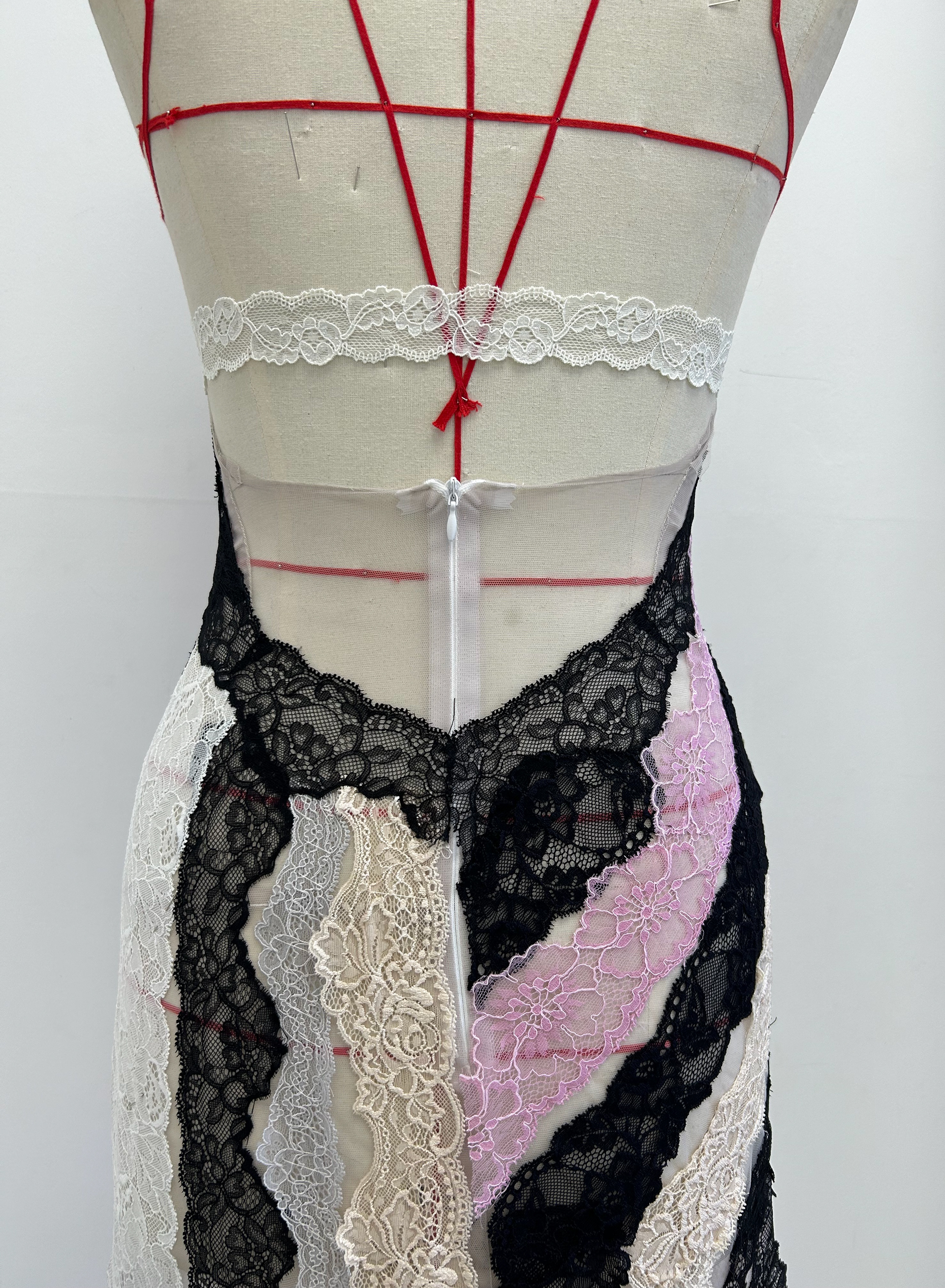 Look 30: Lace dress constructed using a series of laces of various sizes directly on the mannequin