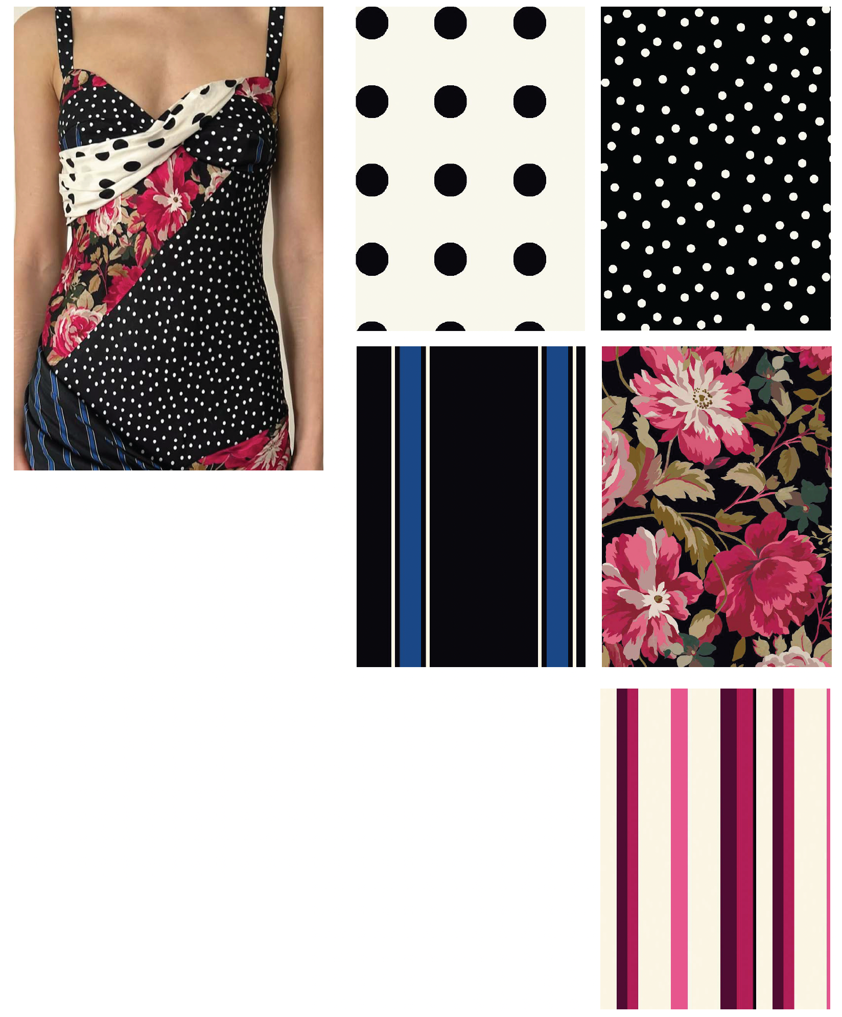 Development of a black-and-white print inspired by a beach towel. The design uses the black areas as a negative, allowing sections of the fabric to be removed to reveal layers of contrasting fabrics beneath, creating depth and interplay between the two colors.