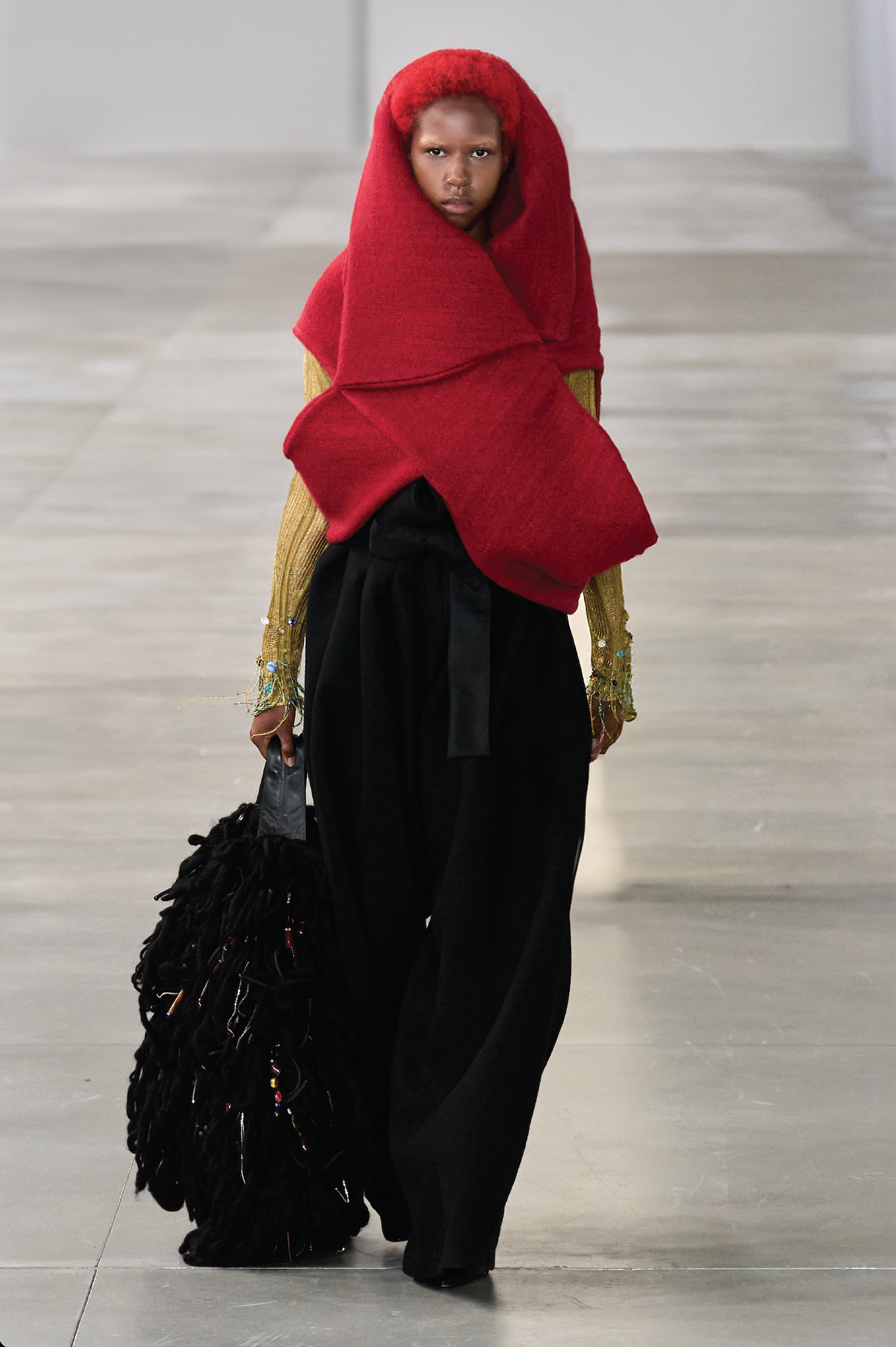 From the Opus Collection, Odeon ensemble features hand-knitted and felted wool pieces with intricate embroidery details. The top showcases tight drop-stitch knitting with beaded and chain embroidery, echoed in the gloves’ fringe. The loop-stitch beaded bag, originally designed as boot covers, complements the ensemble, highlighting the detailed hand-embroidery throughout.